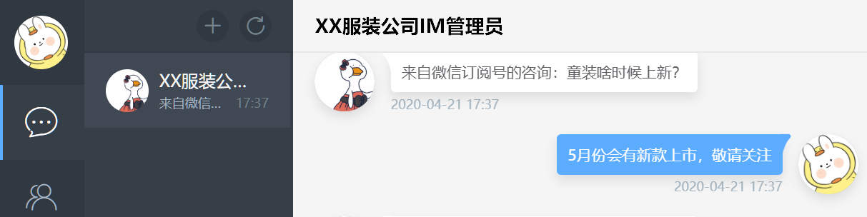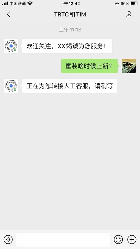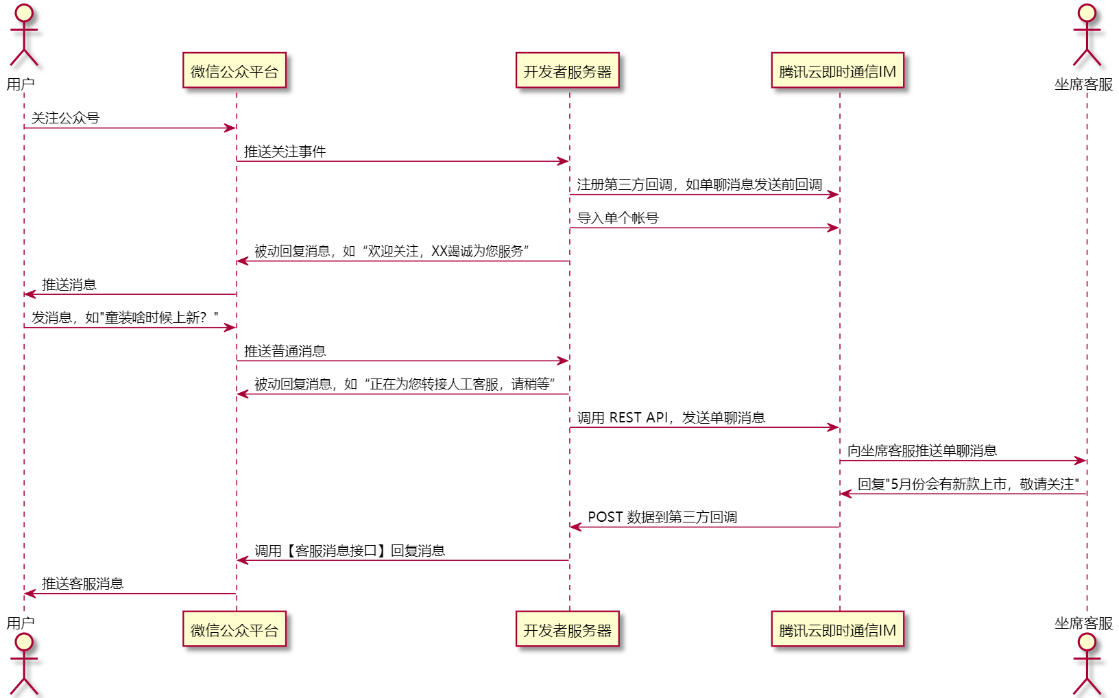- 客服人员回复“5月份会上新,敬请关注!”,消息经过腾讯云 IM 系统和微信传输推送给客户。