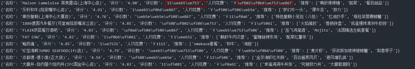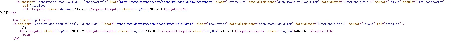 self.woff = { "\uf0b6": "0", # "": "1", "\uf802": "2", "\ueeb5": "3", "\ueb5e": "4", "\uf508": "5", "\ue867": "6", "\ue753": "7", "\uf0a6": "8", "\uf506": "9", } 不要正对着数据抄写,点评的字体svg经常改变。需要自己对应当时的情况写一下省下的就是直接处理数据和解析数据了。
