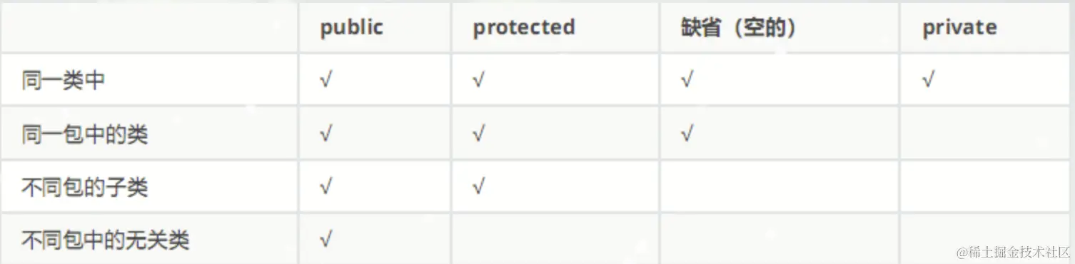 Java规定的4种权限修饰符:private、public、缺省、protected