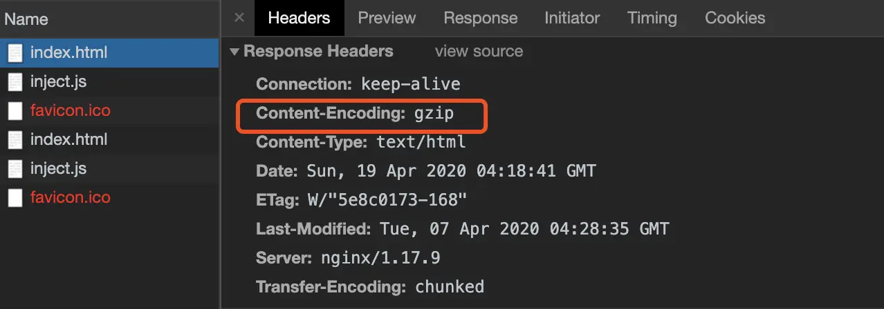 如图二中的红框标识,能看到响应头带上了Content-Encoding: gzip 标识,就说明你配置的gzip压缩功能起效果了。