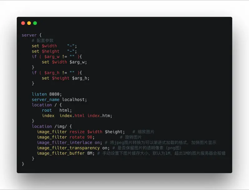 Nginx 配置好这个模块之后,你只需要访问类似 http://127.0.0.1:8080/img/weiciyun.jpeg?w=100&h=100 这种url,就可以拿到你想要的图片资源。针对是极大的丰富了我们的前端生产力。