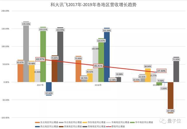 2019年,科大讯飞的营收增长中,有近70%都来自于华中地区,之后是华南地区(12.33%)和华北地区(9.77%),但增速都没有跑赢大盘。