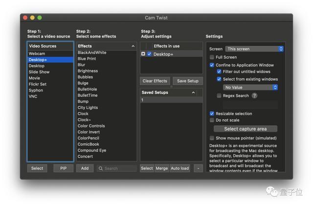 Mac用户运行Avatarify后再打开CamTwist,使用时先选中Desktop+,再点击Select,然后在右侧的Settings一栏选中Confine to Application Window,在下拉菜单中选择python (avatarify)。