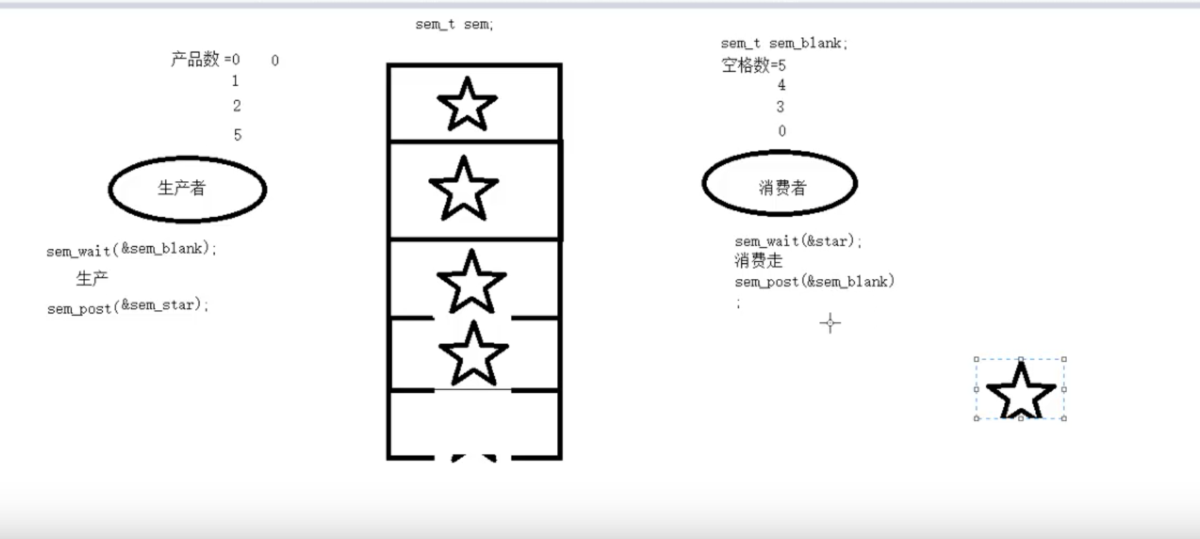 sem_init(&blank_number, 0, NUM); //初始化空格子信号量为5