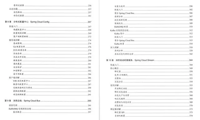消息总线:消息代理、RabbitMQ实现消息总线、基本概念、安装与使用、快速入门、整合Spring Cloud Bus、原理分析、指定刷新范围、架构优化、RabbitMQ配置、Kafka实现消息总线、Kafka简介、快速入门、整合 Spring Cloud Bus、Kafka配置、深入理解、源码分析、其他消息代理的支持。