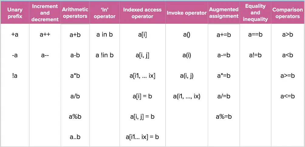 目前 Kotlin 支持的重载操作符有这些。
