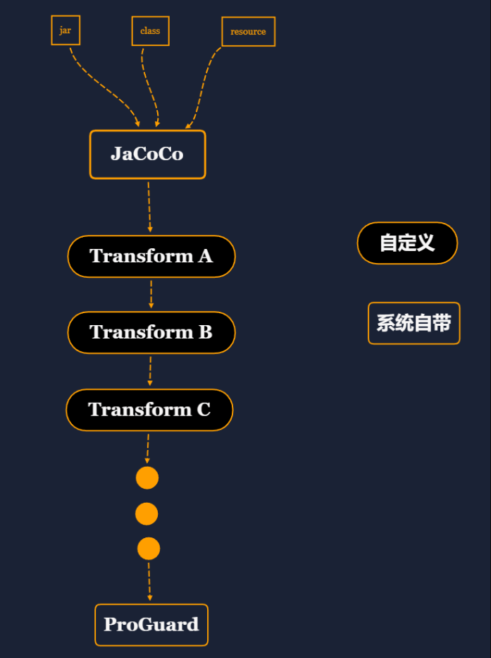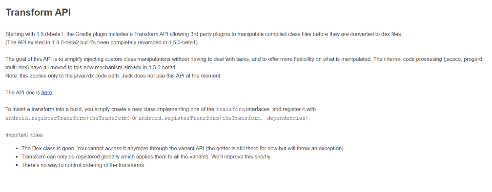 网页上讲从Android Gralde插件1.5.0版本开始,添加了Transform API,来允许第三方插件在经过编译的class文件转换为dex文件之前对其进行操作。Gradle会按照以下顺序执行转换:JaCoCo->第三方插件->ProGuard。其中第三方插件的执行顺序与第三方插件添加顺序一致,并且第三方插件无法通过Api控制转换的执行顺序。