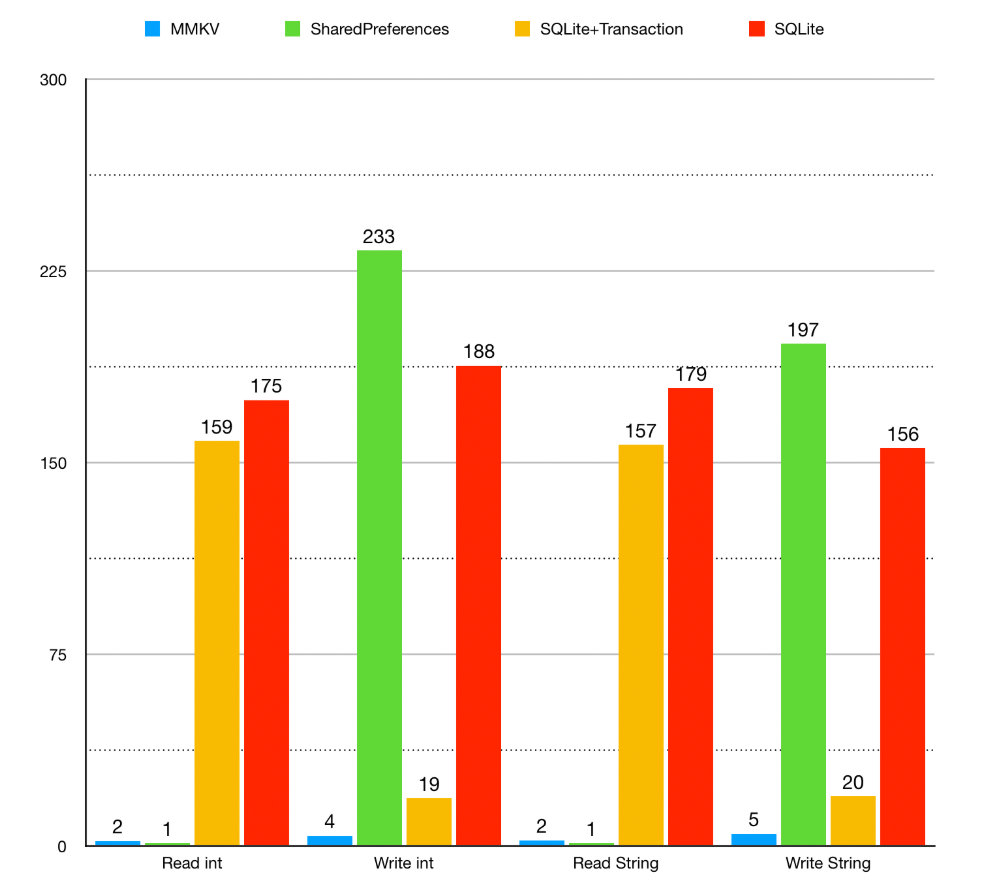 单进程情况下,在华为 Mate 20 Pro 128G,Android 10手机上,每组操作重复 1k 次,结果以ms为单位,可以看见MMKV的效率很高。
