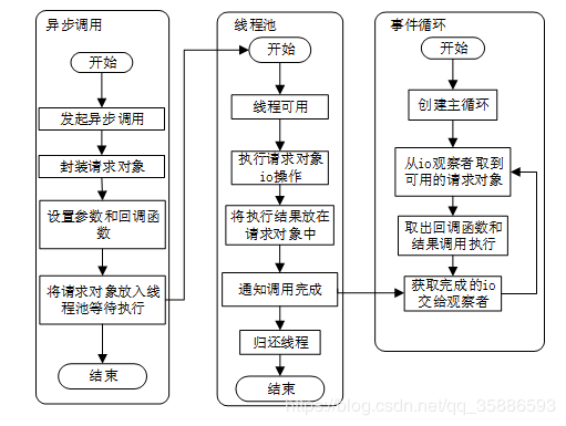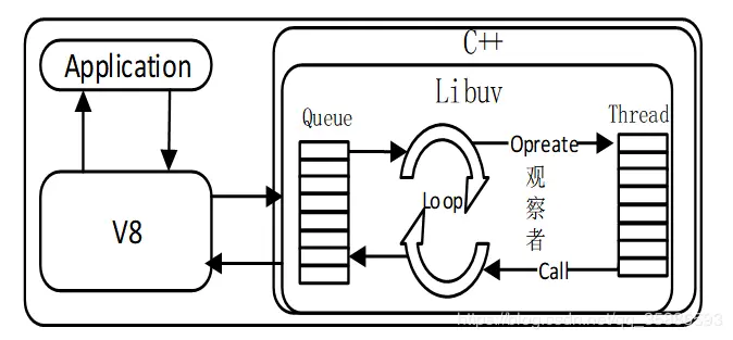 1) 从JavaStricp调用Node的核心模块,核心模块调用NodeJs API,NodeJs API通过libuv进行系统调用。