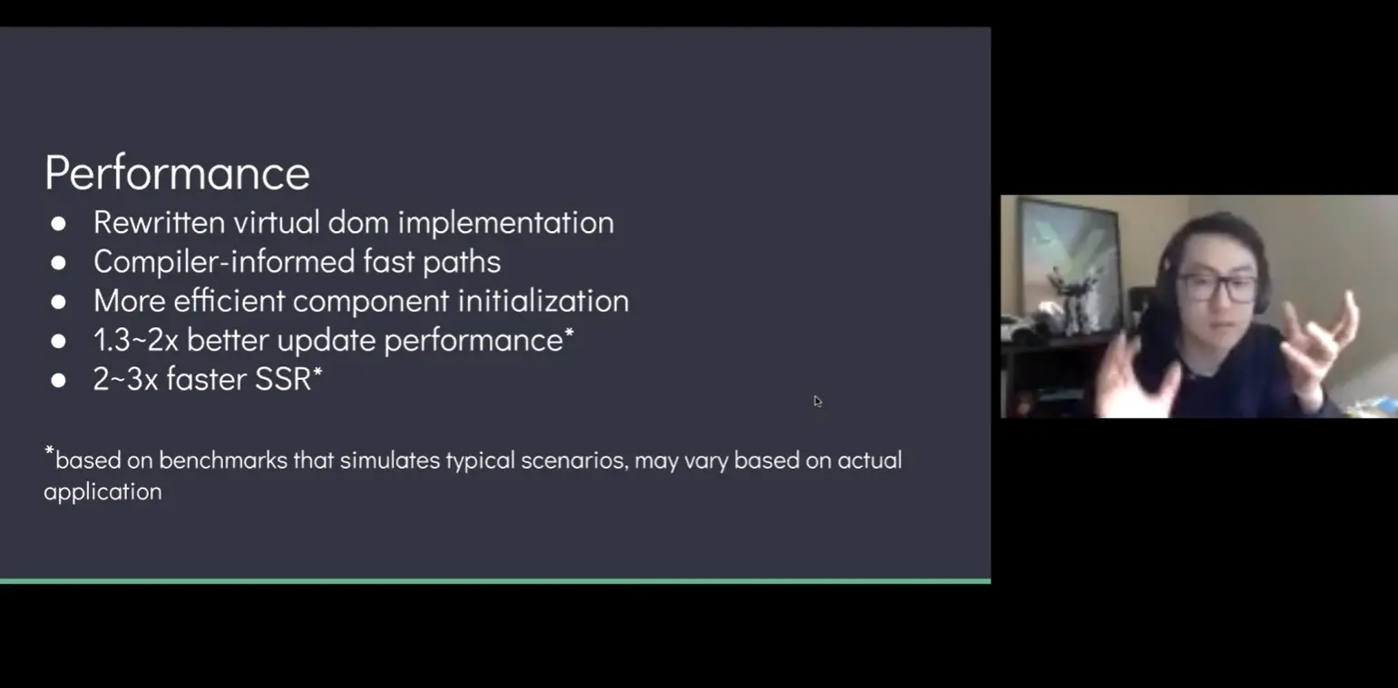 比如 重写了virtual dom,然后编译模板有了很大的优化
