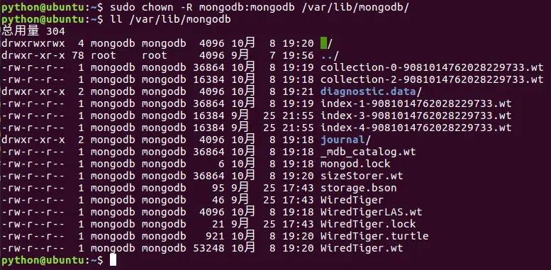 1 | sudo chown –R mongodb:mongodb: /var/lib/mongodb/ |