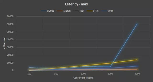 rpcx的最大响应时间都小于1秒,Motan的表现也不错,都小于2秒,其它两个框架表现不是太好。