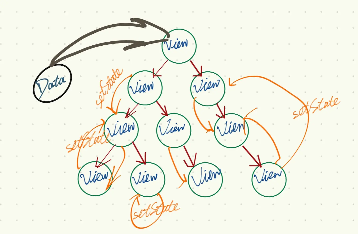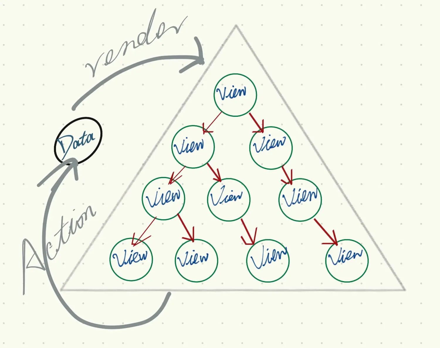 如上,如果我们的页面足够复杂,那么view 背后state 的变化就可能呈现出这个样子。不同的 component 之间存在着父子、兄弟、子父、甚至跨层级之间的通信。