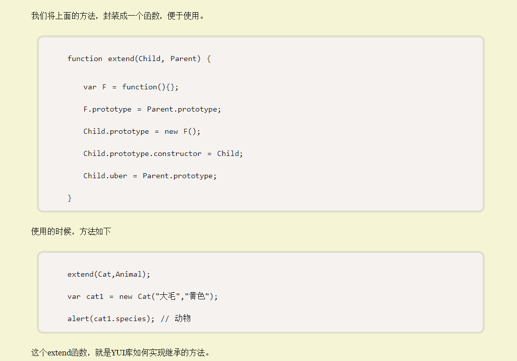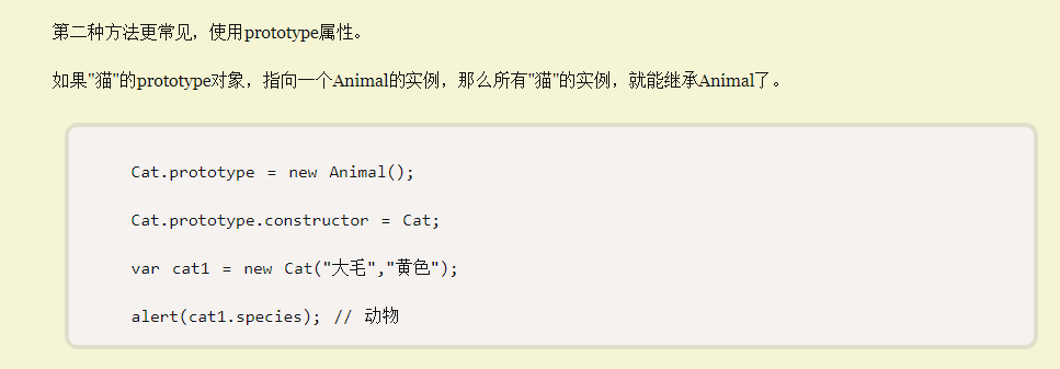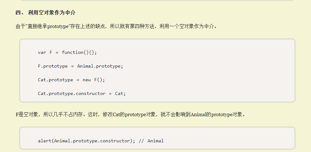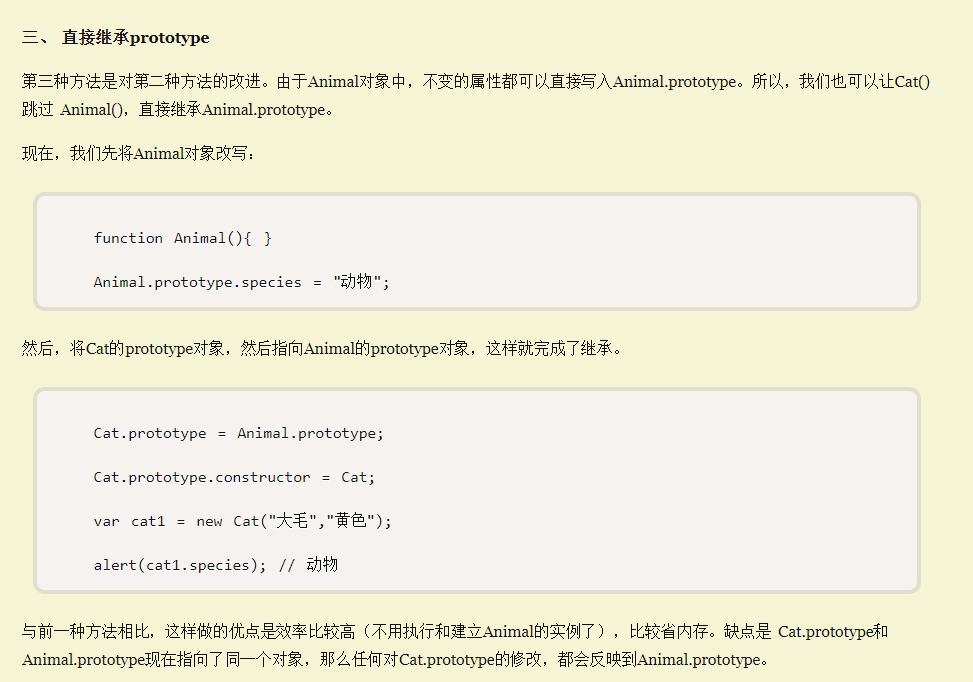 帮助理解继承(作者私人仓库) MrLiAng105105 2020-04-24 148 阅读1分钟 继承有好几种方法。 1、构造函数绑定: 2、prototype模式 3、直接继承prototype 优点:效率,省内存。 缺点:两个prototype指向了同一个对象。 4、利用空对象作为中介 5、拷贝继承 (本文内容来自阮一峰个人网络日志)