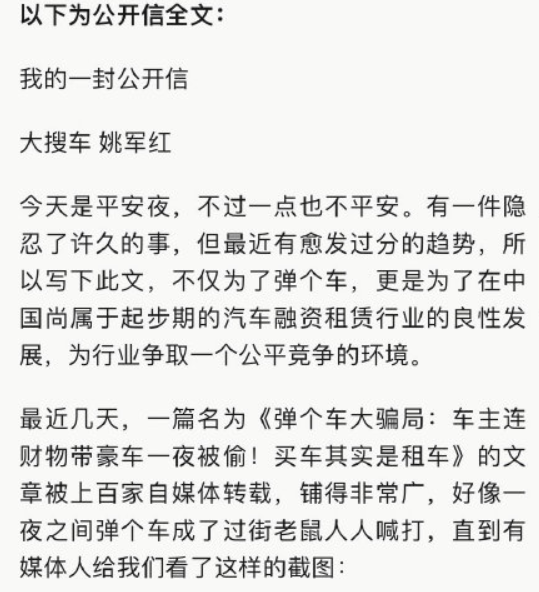 去年年底,姚军红在朋友圈发了封公开信,称竞争对手安插商业间谍,以及安排职业投诉者煽动客户组成维权群,通过恶意抹黑方式攻击弹个车。