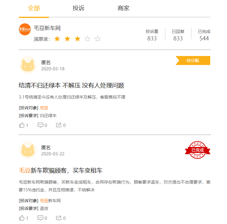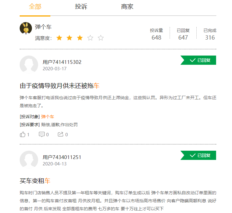 仅黑猫投诉上,弹个车投诉帖就有648个,投诉内容以“买车变租车、”“暴力拖车”、“虚假宣传”、“高额违约金”为主。