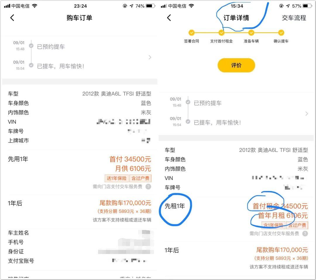 然而下单成功后,订单却被偷偷修改为“首付租金、首年月租、租车”,且订单中的“先用12个月”,也变成了“先租1年”。