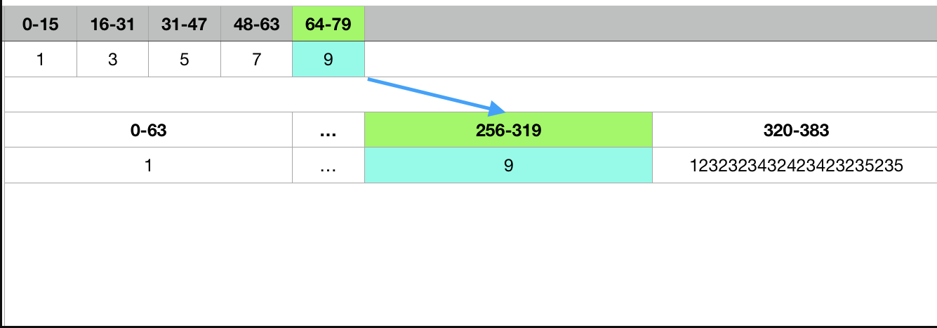 - “9”元素排名第5位,“9”开始移动,从原先的(64-79)移动到(256-319),以此类推。