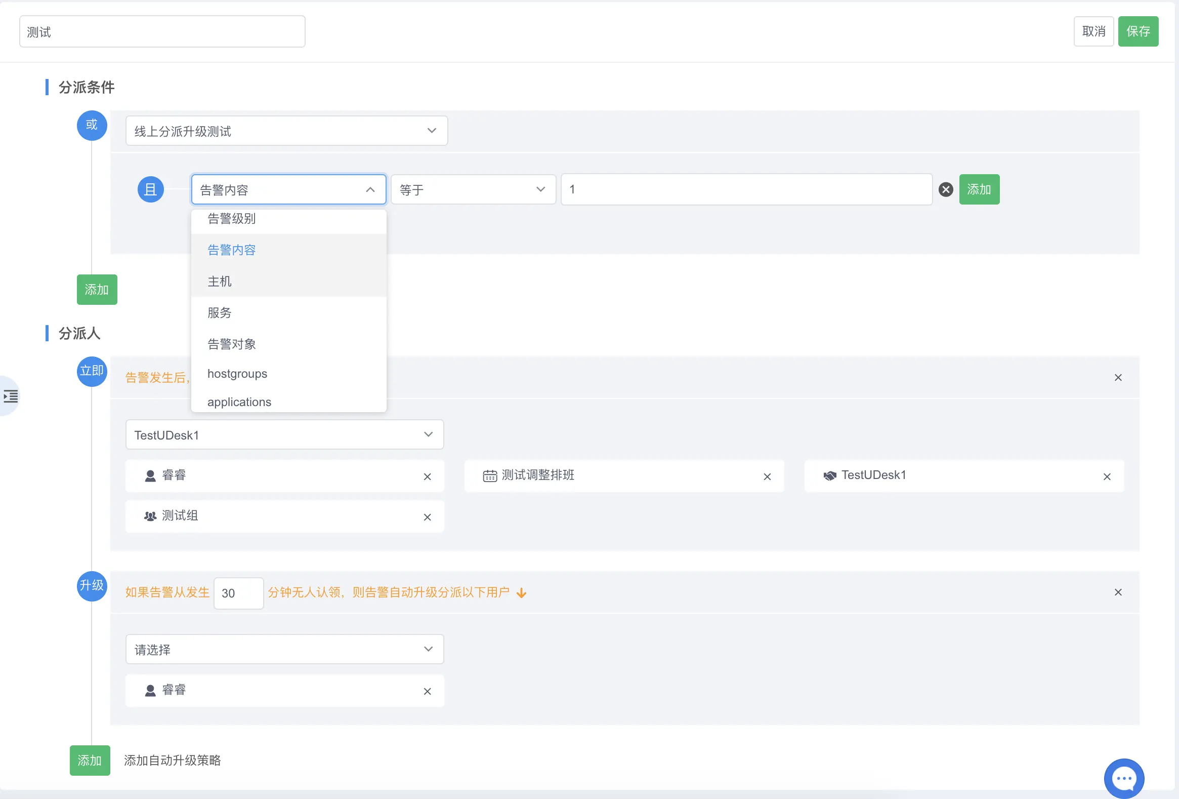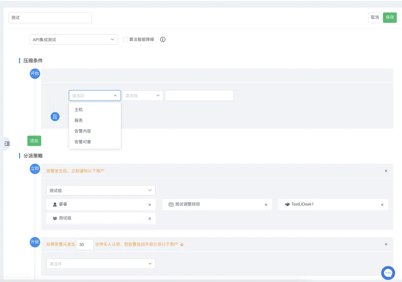 用户可以在分派策略中添加筛选条件,将指定的告警分派给指定的人,也可以分派给钉钉、值班人员、小组;并且可以添加分派升级策略,当告警指定时间内未被认领或关闭时,会通知到第二负责人。