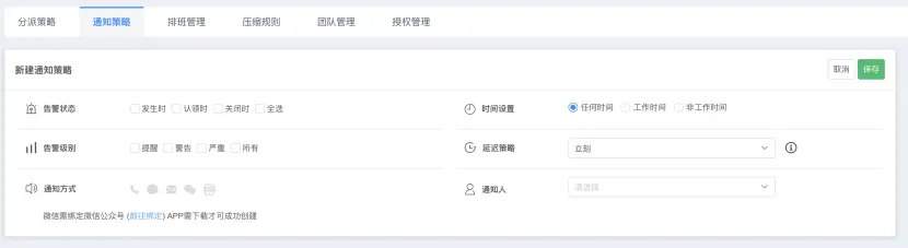 用户可以根据告警不同的状态、不同的时间、不同的级别,以不同的方式,通知到指定的人,目前支持的通知方式有电话、短信告警、微信、邮件、APP。用户也可也选择是否延迟通知。