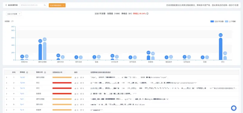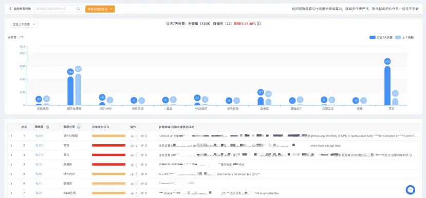用户可以通过高聚合智能算法降噪或者是仿阅读智能算法降噪,从而达到事后告警的分析效果,使得用户可以发现告警的主要根因问题。