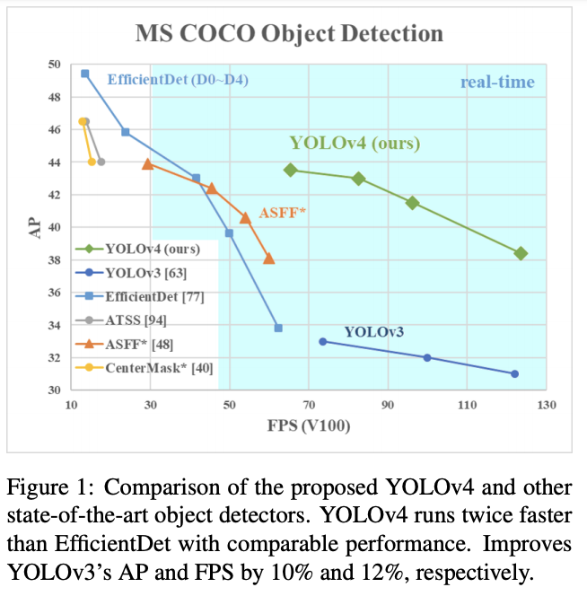 论文提出YOLOv4,从图1的结果来看,相对于YOLOv3在准确率上提升了近10个点,然而速度并几乎没有下降,论文主要贡献如下: