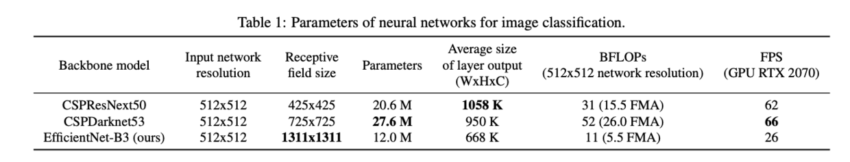 理论来讲,应该选择感受域更大且参数了更大的模型作为主干网络,表1对比了三种SOTA主干网络的,可以看到CSPDarknet53的感受域、参数量以及速度都是最好的,故选其为主干网络。