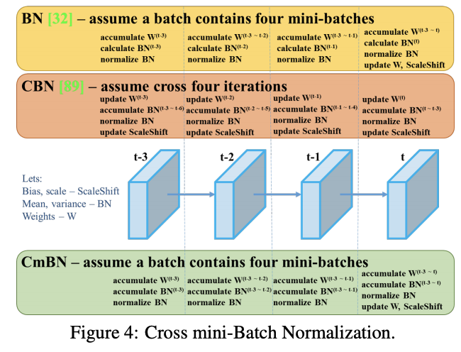 CmBN是改进版的CBN,仅统计single-batch中的mini-batch,如图4所示,假设t-3~t为single-batch中的mini-batch,若干single-batch中包含单个mini-batch,则CmBN与BN一样。