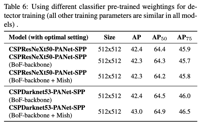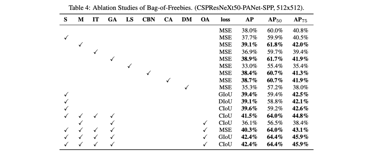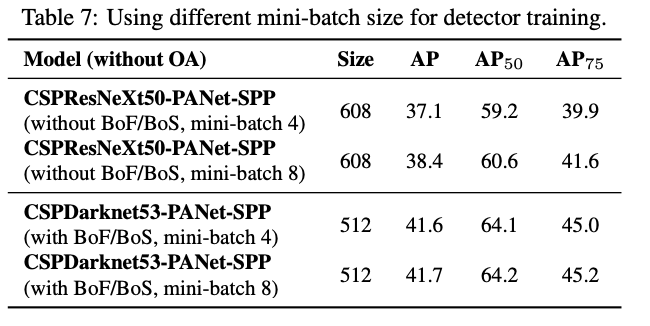 论文对比了不同的mini-batch大小下的检测准确率,在加入BoF和BoS训练策略后,mini-batch的改变几乎对准确率没有影响。