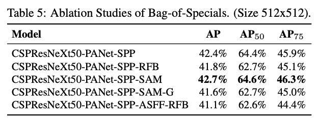 论文也对比了检测端的BoS,从结果来看,SPP、PAN和SAM同时使用时效果最好。