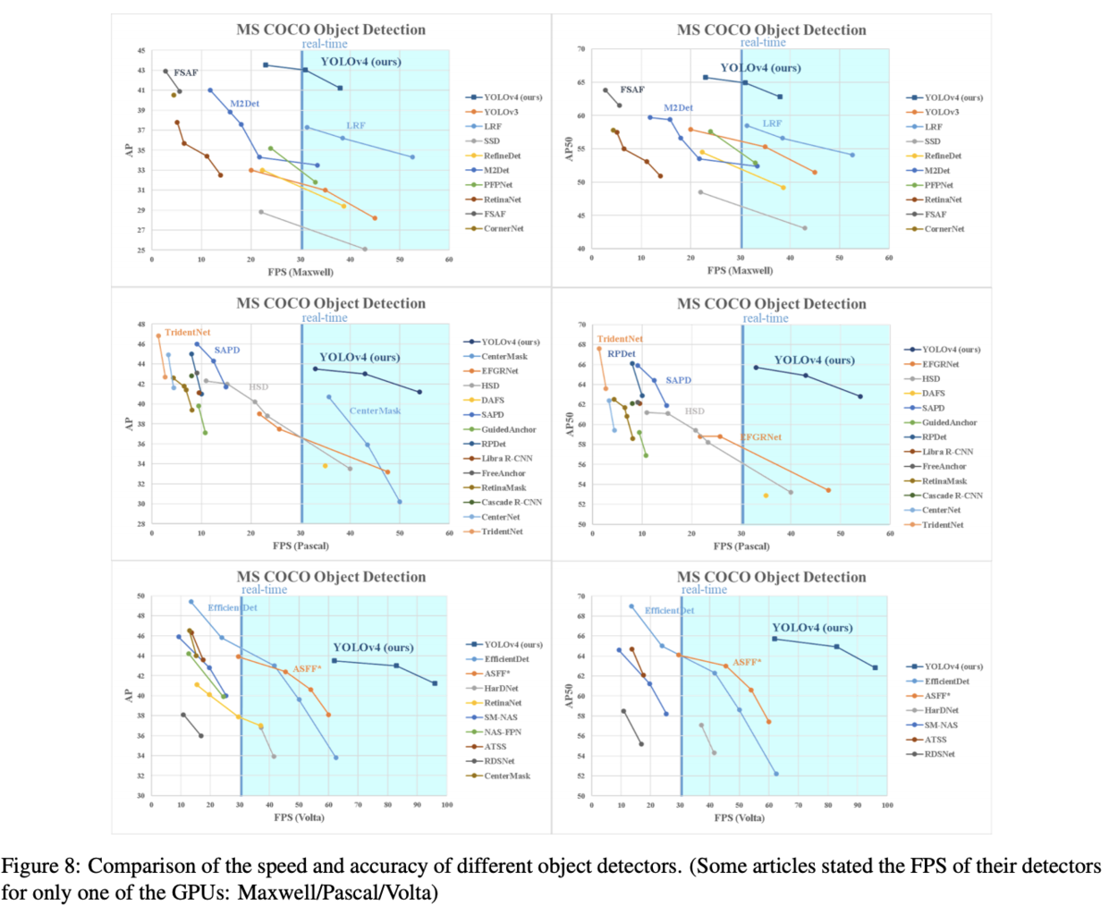表8、9和10分别为Maxwell GPU、Pascal GPU和Volta GPU上的实验结果,从大量的实验对比来看,YOLOv4在速度和准确率上都十分耐看。