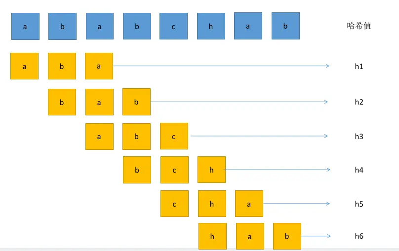 RK 算法的核心:将主串依次拆分为模式串长度的子串,并通过哈希公式,计算出每个子串的哈希值,与模式串的哈希值比较,相等则匹配成功。