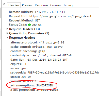 在http请求的Response Headers中携带了x-frame-options: SAMEORIGIN。MDN上说HTTP 响应头是用来给浏览器 指示允许一个页面 可否在<frame>, <iframe>, <embed> 或者 <object>中展现的标记。站点可以通过确保网站没有被嵌入到别人的站点里面,从而避免clickjacking (维基百科竟然没有解释...) 攻击。