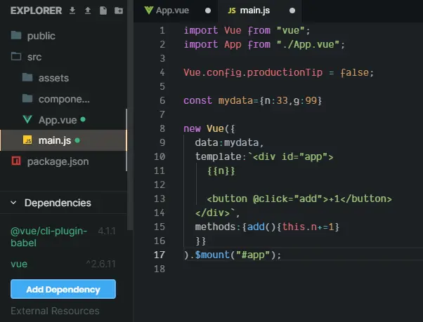 现在我们分别使用 Vue 两种不同版本的构建工具实现一个点击按钮数字加一的功能,来具体看一下两种版本的实现方式: