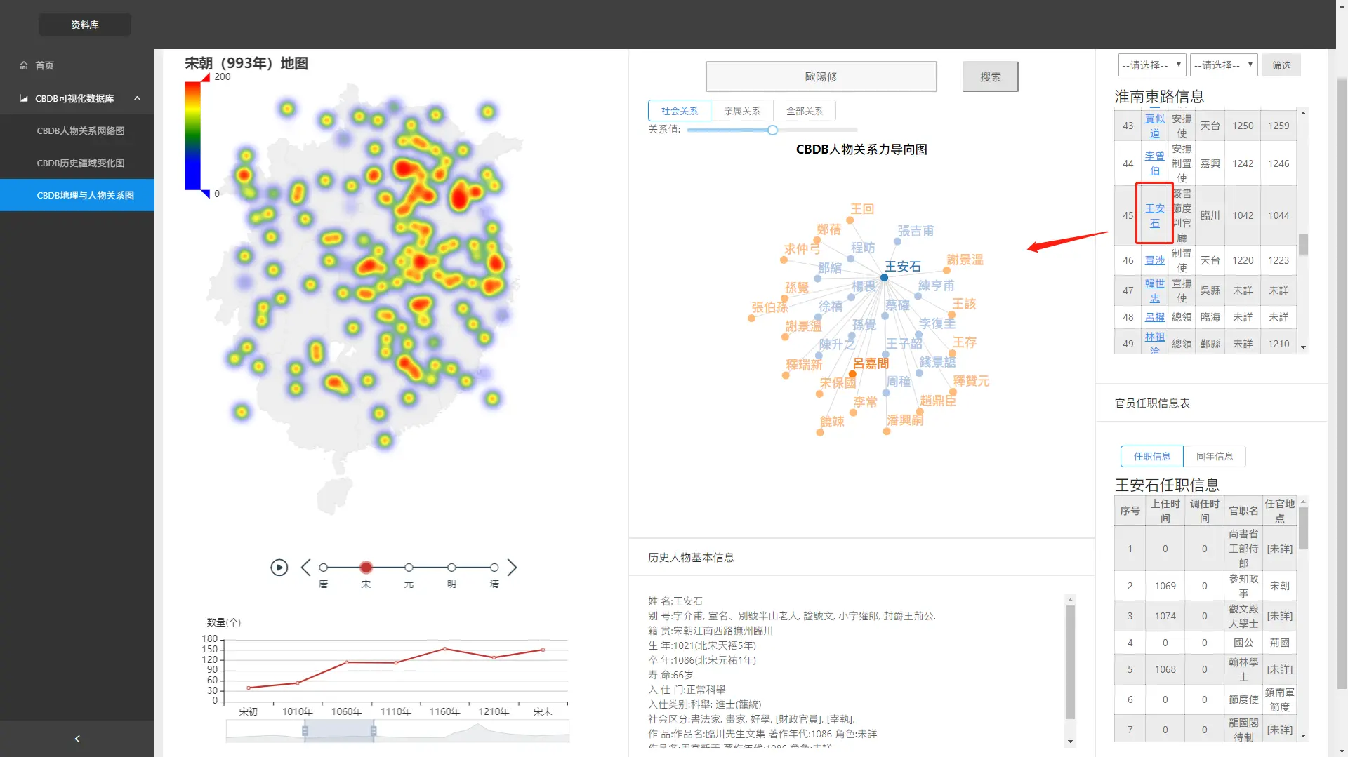 目前,本系统对唐宋元明清等五个朝代的历史人物信息进行了多视角、多维度的展示。系统中包括了人物关系力导向图、各朝代的人口分布密度图、各朝代疆域变化图、人口变化折线图以及升迁信息表等数据展现形式。系统整体预览图如下: