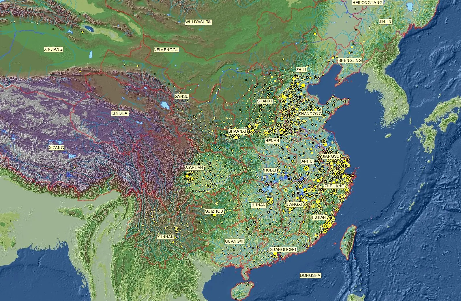 截止2019年4月为止,该资料库共收录约427,000人的传记资料,这些人物主要出自七世纪至十九世纪。该资料库除可作为人物传记的一种参考资料外,亦可用于统计分析与空间分析之用。下图是 CBDB 中已知籍贯的 67,000 历史人物的地理分布图: