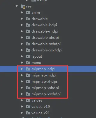 mipmap-mdpi、mipmap-hdpi、mipmap-xhdpi、mipmap-xxhdpi、mipmap-xxxhdpi。