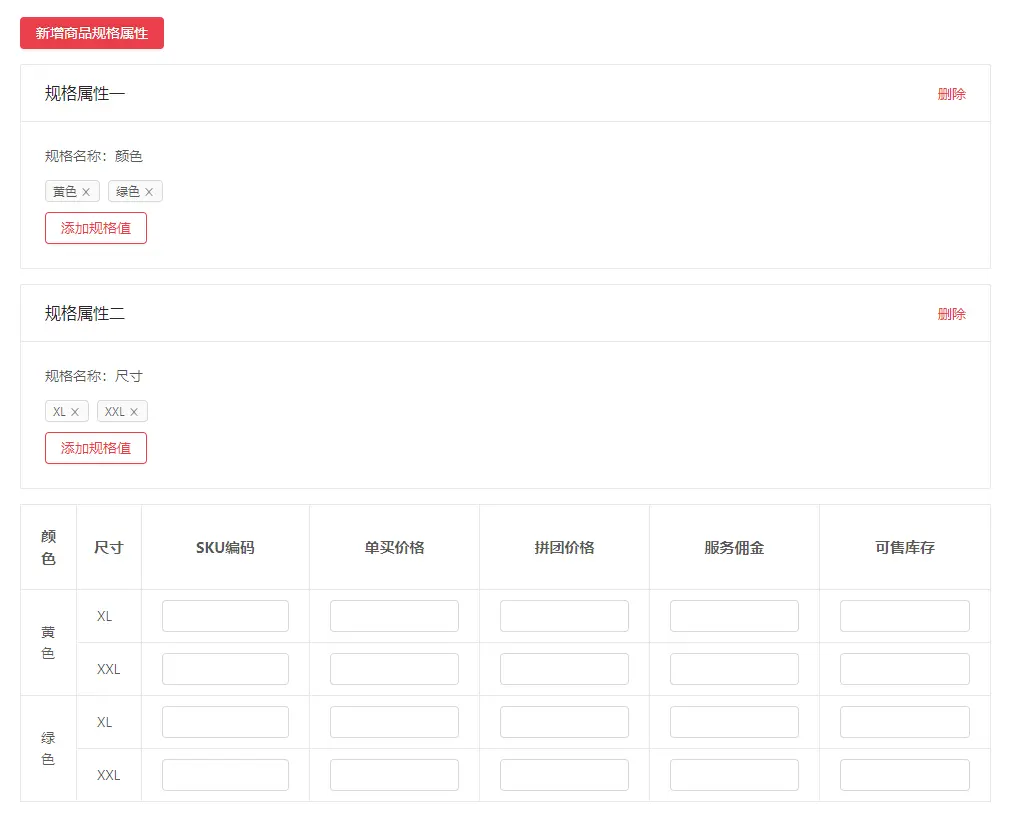 上面这一块添加规格还有,添加规格值,我这边就忽略不讲了,比较简单