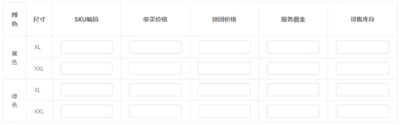 这里就是我添加了商品规格还有商品规格值之后的数据结构,这个时候我们就要想怎么才能把这个数据渲染成下面这个表格