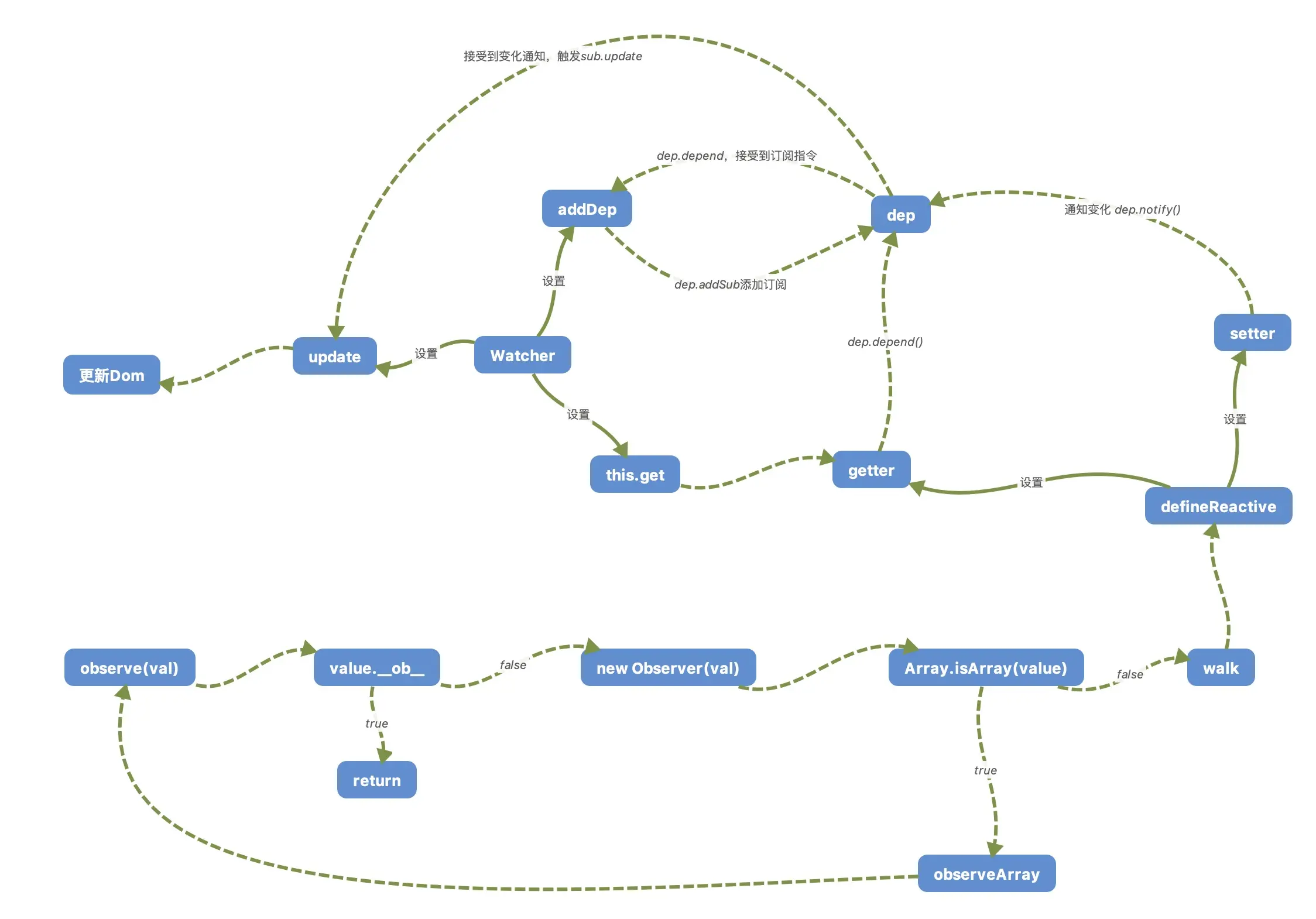 vue数据相应中,Dep起到了一个桥梁的作用,用来连接Observer和Watcher。当getter执行当时候,会调用dep.depend(),其中,Dep.target则指向当前active当Watcher,并调用Dep.target.addDep,即watcher.addDep方法,将闭包中当dep添加到watcher.deps列表中,并在addDep中调用dep.addSub,将当前当watcher添加到dep.subs列表中。当setter执行当时候,会遍历dep.subs列表,依次执行watcher.update,来进行更新操作。