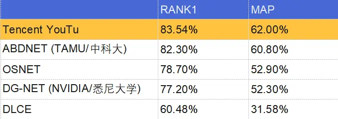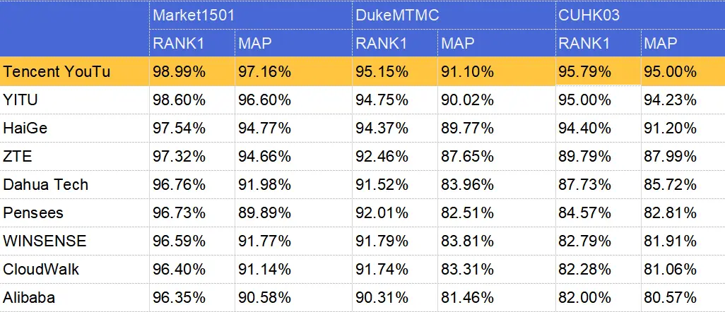 通过引入跨场景ReID,腾讯优图在三个数据集中刷新业内最好的水平,其中Market-1501数据集的RANK1达到98.99%。RANK1和MAP作为衡量ReID技术水平的核心指标,首位命中率高,就意味着算法能够在众多图像中准确找出最容易识别或匹配的那张。
