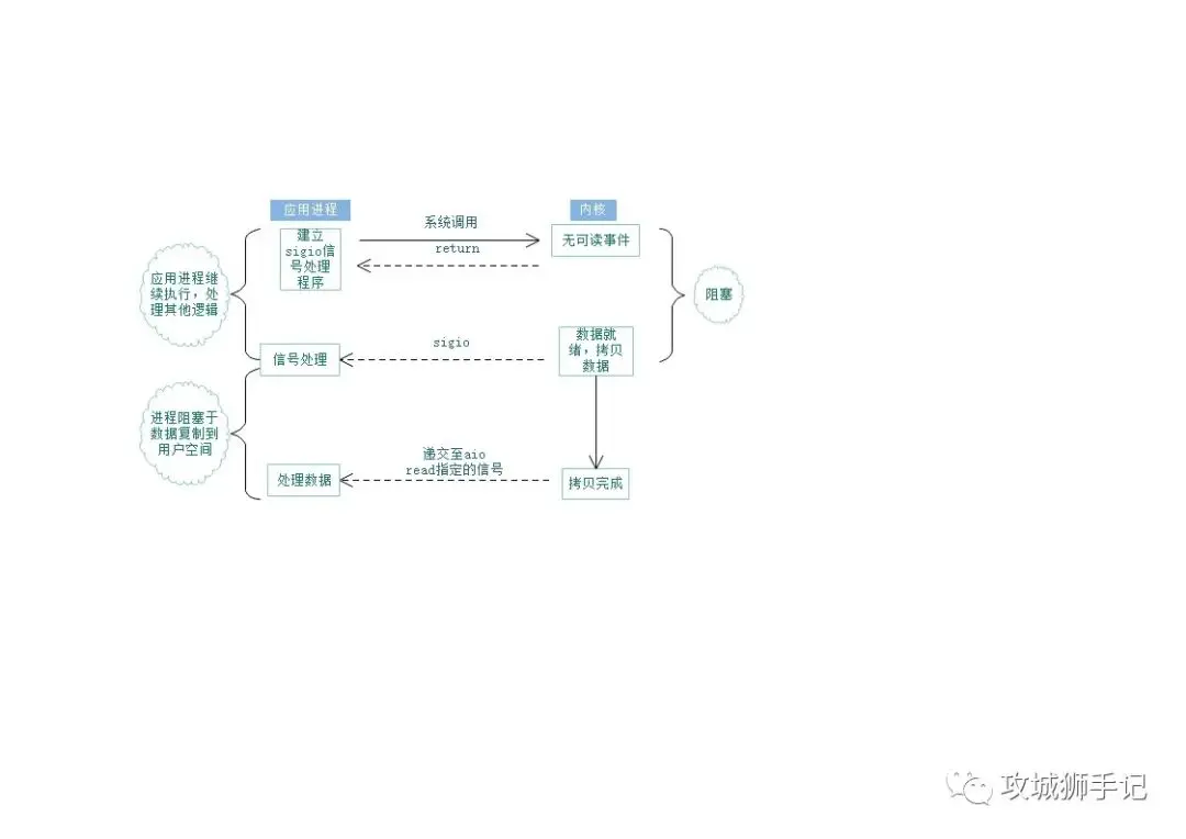 信号渠道I/O类似于观察者模式,内核就是个观察者,信号回调就是个异步通知,用户进程发起I/O操作时,通过系统调用sigaction函数,在对于的套接字注册一个信号回调,此时不阻塞用户进程,当内核数据准备就绪时,内核会为该进程生成SIGIO信号,通过信号回调通知进行I/O操作。