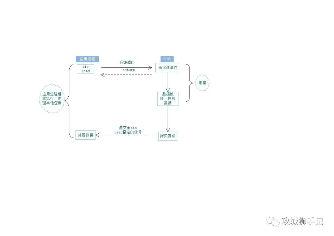 当用户进程发起一个i/o操作时,系统会告诉内核启动某个操作,并让内核在整个操作完成后通知应用进程,这个操作包括把数据从内核拷贝至用户空间。(目前linux暂不支持,Windows已支持)