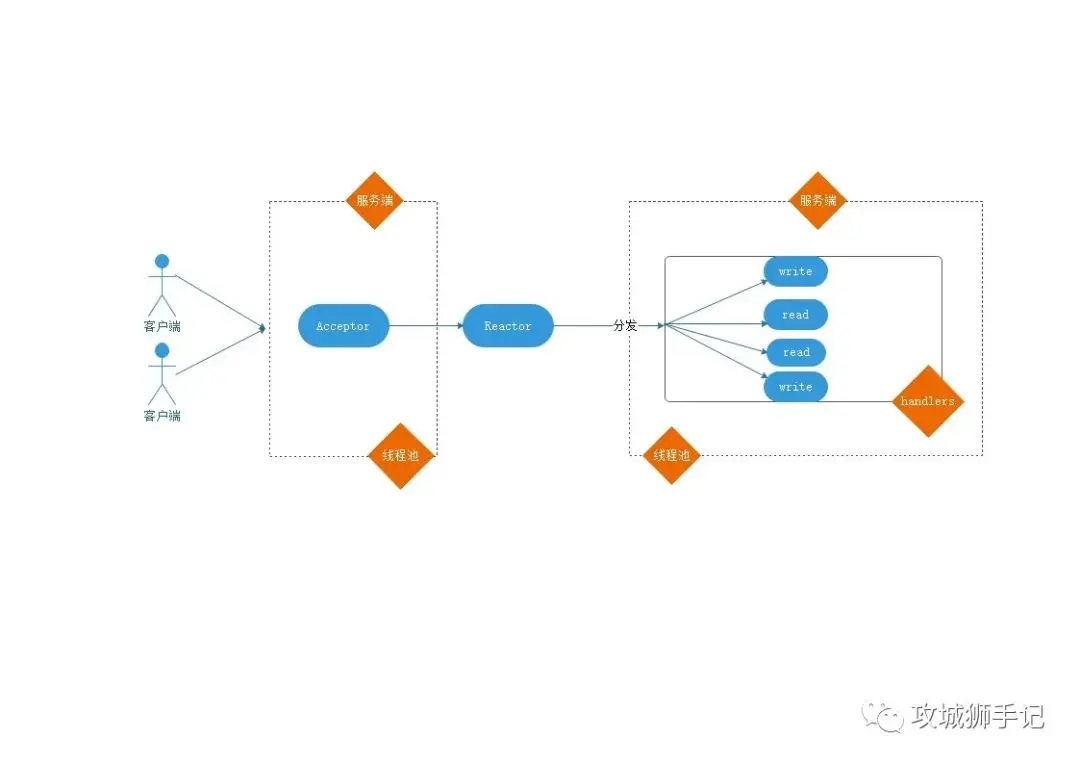 在tomcat和netty中都使用了一个Acceptor线程来监听连接请求,当连接成功后,会将建立的连接注册到多路复用器selector中,一旦监听到事件后,交个worker线程来负责处理,这种模型能解决一定量的客户端请求,但是如果上了一个量级可能还是会存在性能问题,因为只有一个Acceptor。