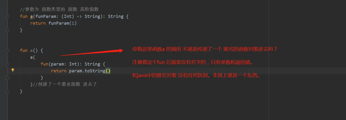 看完上面的例子 我们得出一个结论,kotlin中 函数虽然不是一种类型, 但是我们却可以根据函数的参数和函数的返回值 来抽象出一种定义函数的方式。 就是图中我红色的注释。