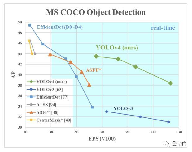 在 COCO 数据集上,YOLOv4 达到了43.5% AP,65 FPS。将 AP 和 FPS 分别提高了10%和12%。运行速度则是 EfficientNet 的 2 倍。