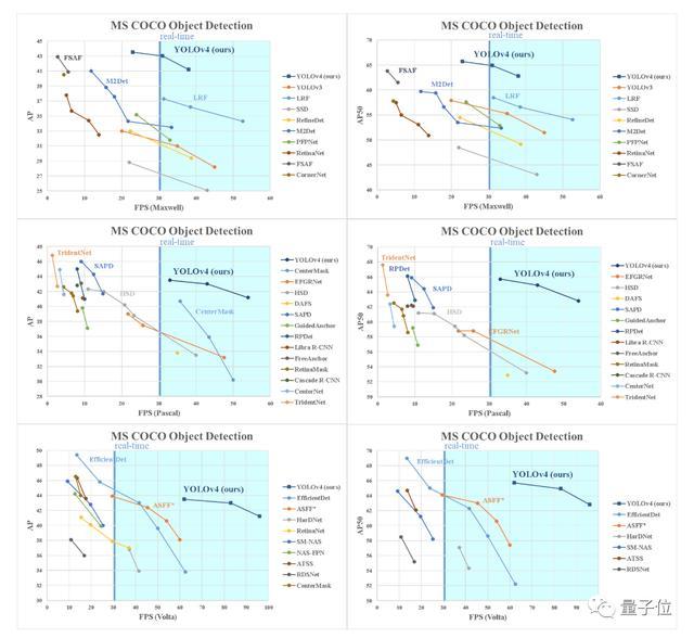 研究人员也将 YOLOv4 分别运行在 Maxwell、Pascal 和 Volta 等不同的GPU架构上。