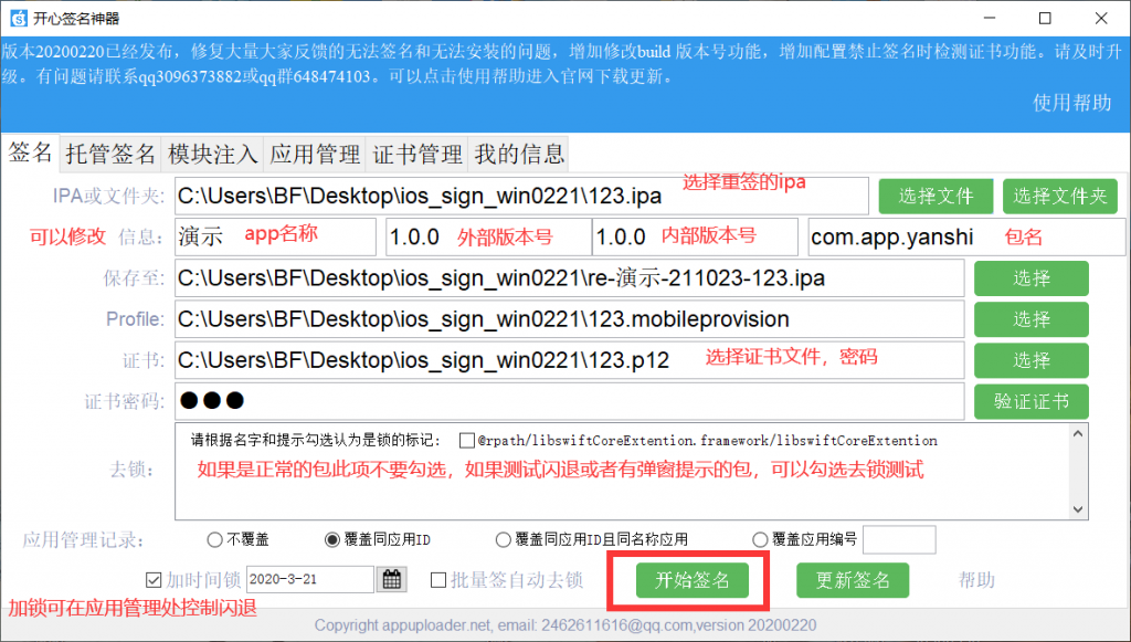 说明:kxsign –sign wechat.ipa -c my.p12 -m my.mobileprovision -p “123456” -o resign-wechat.ipa -id “com.tencent.wechat3” -n “微信马甲3” -v “1.0.0” -dt -at 20200902