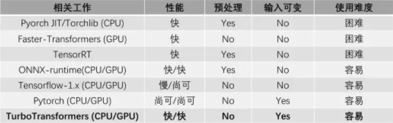 和其他工作的对比如下,TurboTransformers在性能,使用方式都具备优势。