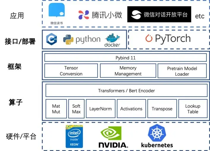 TurboTransformers的软件架构如下图,它让微信内部众多NLP线上应用能够充分榨取底层硬件的计算能力,让算法更好地服务的用户。
